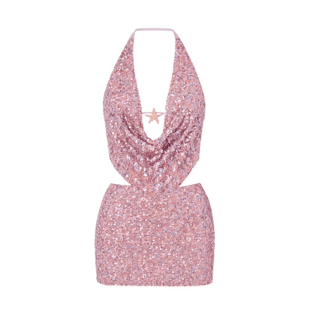 Scintillant, sensuel et fait pour attirer tous les regards, l’Ensemble Dream Girl capture la magie des nuits dorées en bord de mer. Confectionné dans un mélange souple de polyester et d’élasthanne, ce deux-pièces éblouissant se compose d’un top à col halter orné de sequins, doté d’un décolleté drapé et d’un détail étoile de mer dorée au centre, accompagné d’une mini-jupe ajustée qui sublime la silhouette.