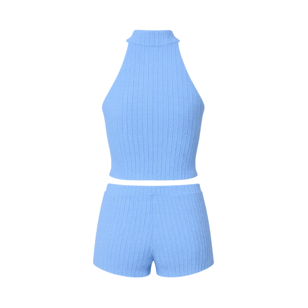 Chic sans effort et infiniment confortable, l’Ensemble Wave Bloom offre l’équilibre parfait entre douceur et style. Confectionné dans un mélange souple de polyester et d’élasthanne, ce deux-pièces côtelé se compose d’un top crop à col halter au dos nu et d’un short taille haute ajusté, pour une silhouette flatteuse et sculptée.